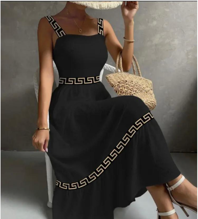 Turn heads in this stunning Geo-Print Maxi Dress! The chic A-line silhouette flatters effortlessly, while the geometric pattern adds a modern flair. Its square neckline and ruffle decoration blend sophistication with fun. Perfect for vacations or daily wear, this dress offers slight stretch for comfort. And with its high waist design, it’s a flattering fit for all. Easy to care for – a wardrobe must-have!