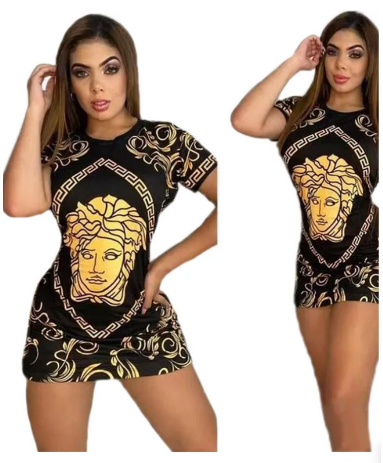 The Medusa Casual Print Dyeing Romper is a stylish and sustainable choice for women. Made from a breathable cotton-polyester blend, this formal dress features a simple Medusa print, O-neckline, short sleeves, and a straight silhouette. It’s perfect for summer with its mini length and is ideal for those seeking a blend of elegance and comfort.